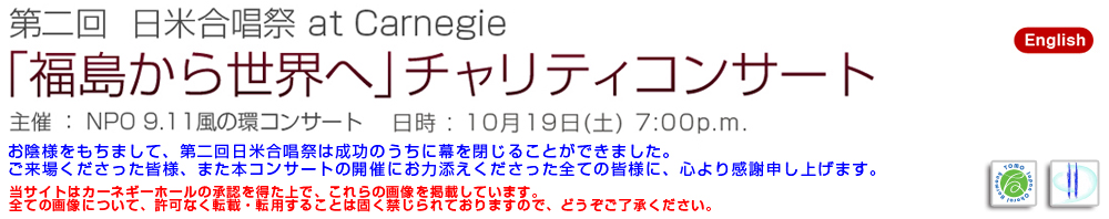 参加者募集私たちと一緒に、カーネギーホールで歌いませんか?あなたもジャパン・コーラル・ハーモニー「とも」と一緒に、カーネギーのステージで歌ってみませんか?ご興味がおありの方は、参加申込用紙にご記入の上、下記のメールアドレスまでお送りください。折り返し、担当よりご連絡差し上げます。 ※JCHの練習日程については、JCHオフィシャルサイトのカレンダーをご参照ください。(色のついている日にちが練習日です。クリックで詳細がご覧になれます)。 ★ メールフォーム&申込用紙送付先:japan.choral.harmony@gmail.com |